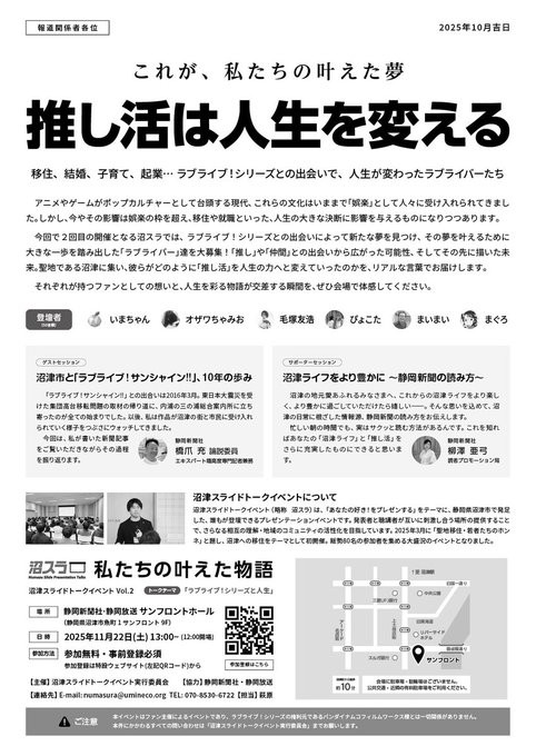 第2回の開催となる “沼スラ” では、ラブライブ!シリーズとの出会いをきっかけに新たな夢を見つけ、その夢を叶えるための一歩を踏み出した「ラブライバー」たちが登壇します。